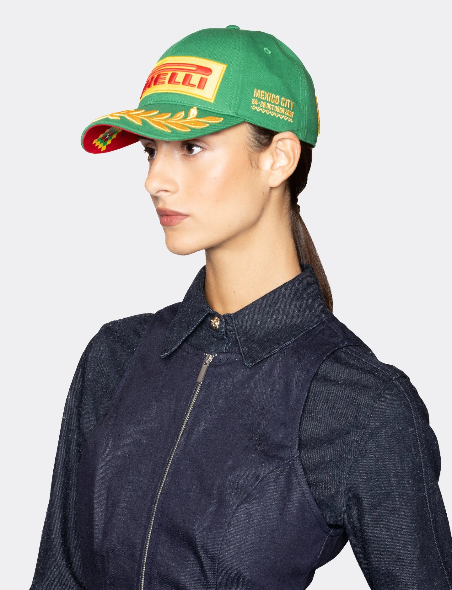 Viva la velocidad. The Pirelli Podium Cap – Special Edition Mexico celebrates Formula 1®’s return to one of the sport’s most spirited venues. Designed in the same championship-winning silhouette as the official Pirelli Podium Cap, this edition bursts with national pride — a bold green base accented by gold embroidery and the unmistakable red-and-yellow Pirelli logo. Every detail nods to Mexico’s race-week energy: the “1ST” emblem on the side, the embroidered Mexico City 24–26 October 2025 mark, and the intricate Aztec-inspired motifs printed under the vibrant red brim. Inside, yellow Pirelli taping and precise stitching reflect the craftsmanship that Pirelli products are known for. A snapback closure, complete with Mexican flag, ensures the perfect fit — whether you’re in the grandstands at Autódromo Hermanos Rodríguez or celebrating from home.
